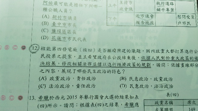 依據題幹中畫線部分之內容,可知人民依法行使複決權後,政府即應依法定程序修法與施政,符合民意政治與法治政治之特色,故選(D)。