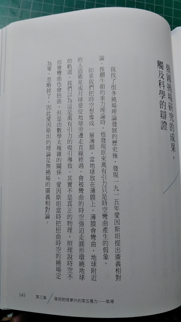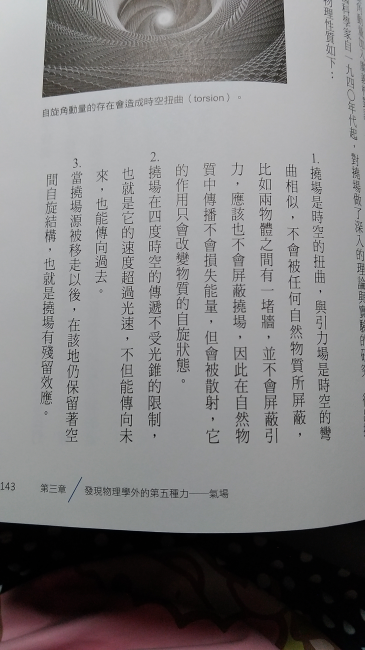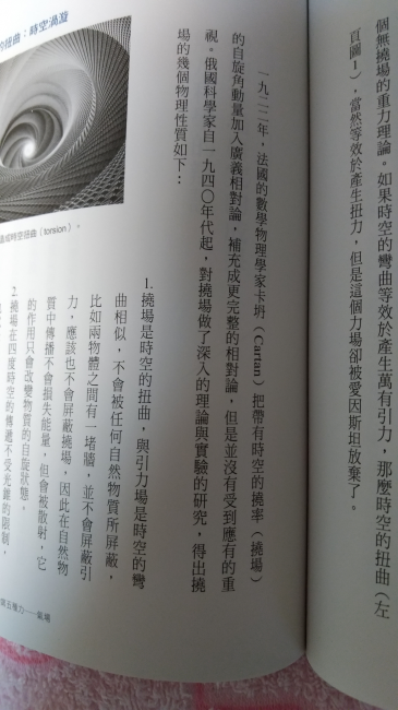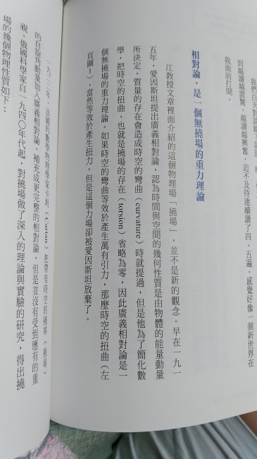 老師您好: 我這邊有個問題想請教,關於萬有引力和廣義相對論,這是我在看完一本書後有的疑問,這本書內說,在1915年愛因斯坦提出廣義相對論時發現,「萬有引力只是時空彎曲產生的假象」,當時我怎麼想也想不通,但書中舉一個例子「人造衛星」,書中說,愛因斯坦的廣義相對論提出,質量會造成時空的彎曲,而地球具有質量,所以時空會彎曲,而使人造衛星會依彎曲的形狀環繞地球。其中還有說道「時空的扭曲」並說科學界給一個名稱「撓場」,裡面說時空的扭曲會產生扭力與時空的彎曲相似(下面有圖),這是否是在說「人可以站在地上」的那個拉力? 然後後面又講了一些愛因斯坦廣義相對論為了簡化數學,在計算中把撓場省略為零,所以當時他提出的是無撓場的廣義相對論。還有說1922年法國數學物理學家卡坍把撓場的自旋角動量加入廣義相對論,完成更完整的相對論。(書裡表示撓場很難測得,所以逐漸被遺忘)