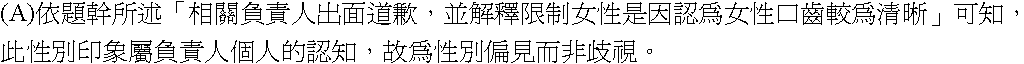 「性別偏見」為基於性別刻板印象,而對於某一性別所產生的負面看法或態度,如題幹中的公司負責人認為女性口齒較清晰,則代表其認為男性的口條相對女性較差,這就是一種偏見。
