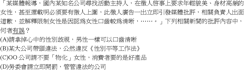 「性別歧視」為因為性別偏見而做出對此性別差別對待的具體行為,進而導致對特定性別造成不利的後果,如題幹中提及的徵人啟事,若沒有限制性別,但應徵的男性薪資卻因口條問題而比女性薪資低時,則為性別歧視。